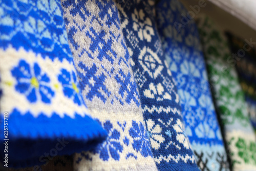 Blue and white Hand-knitted Latvian Wool Mittens. Latvian Rustic mittens, Ethnic style Knitted wool gloves Winter. Christmas Market in Riga, Latvia is full of warm clothes