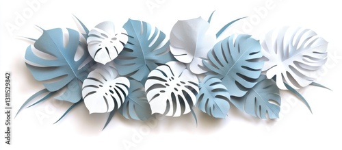 Blue and white paper cut tropical leaves arranged horizontally on a white background, creating a layered botanical composition for decor.