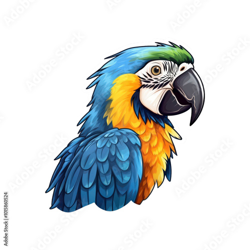 Blue and yellow macaws perched on a branch with green leaves are suitable for nature, wildlife, birds, and tropical themed designs. Generative AI