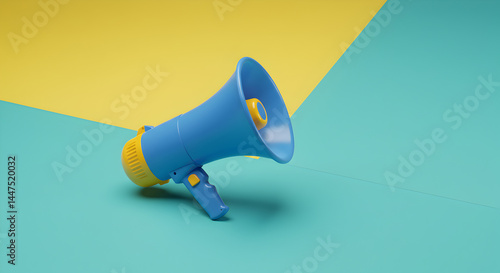 Blue and Yellow Megaphone on a Geometric Background Symbolizing Communication and Announcements in Pastel Colors
