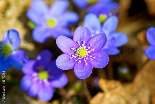 Blue anemone grows among brown leaves.