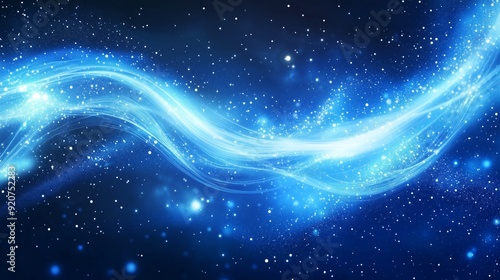 Blue background with white light rays and stars, glowing blue abstract background with swirls of sparkling lights, glowing starry sky, blue background with light beams