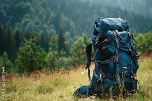 Blue backpack is sitting on the grass in a field. The backpack is large and has a lot of pockets. The scene is peaceful and serene, with the backpack being the only object in the image