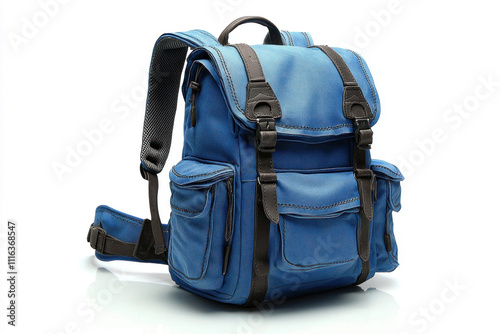 Blue backpack with pockets and buckles isolated on white.