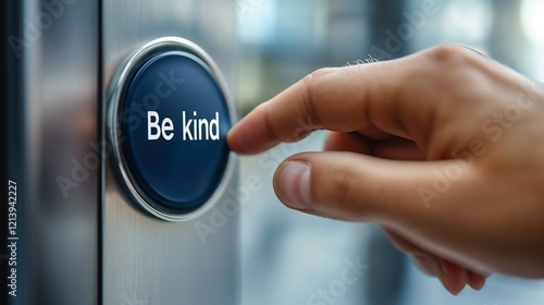 Blue "Be kind" button in light setting. Suitable for social awareness and compassion themes.