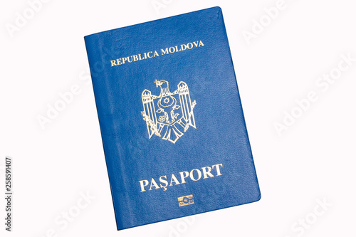 Blue biometric passport of citizens of the Republic of Moldova, isolated on white background. Inscription - Republic of Moldova, Passport
