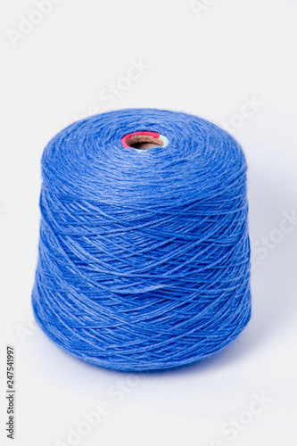 Blue bobbin of yarn on a white background.Textile reel on isolated white background.