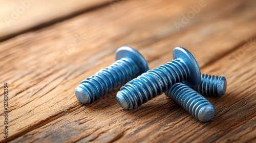 Blue bolts on rustic wood; close-up, industrial setting