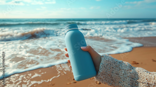 Blue bottle in hand against beach view, waves crashing on the sand with a soft blue sky