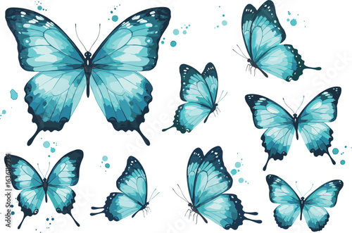 Blue butterfly illustration, white background, artistic paint splashes, gradient wings, flying butterflies, nature beauty, insect art, decorative design, elegant