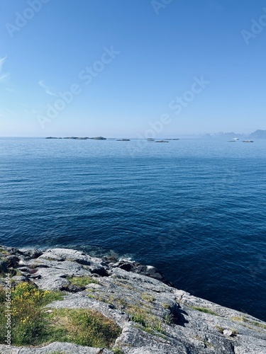 Blue calm ocean bay horizon, small rocky islands, blue sky