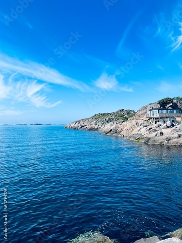 Blue calm ocean bay horizon, small rocky islands, blue sky