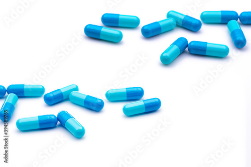 Blue capsule pills on white background. Pharmaceutical industry. Pharmacy or drugstore products. Healthcare and medicine. Health budget concept. Pharmaceutical manufacturing. Group of capsule pills.