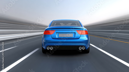 Blue car rear view driving fast on highway with motion blur effect and clear sky