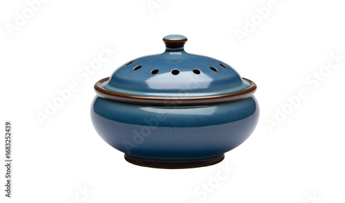 Blue ceramic incense burner with lid brown trim isolated on a transparent background