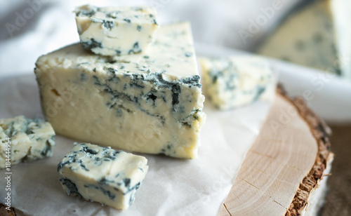 Blue cheese dorbly on parchment paper in the kitchen close up