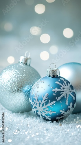 Blue Christmas Ornaments on a Light Blurred Background.