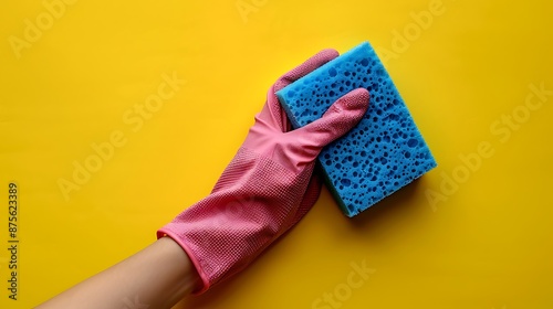 Blue cleaning sponge and hand with pink cleaning glove for household chores and hygiene maintenance, background with copy space on yellow backdrop .