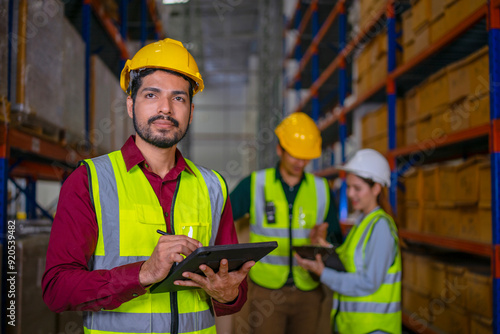 Blue collar workers are working at warehouse.
