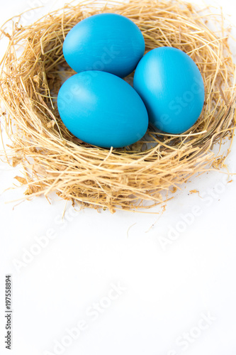 Blue colored Easter eggs in nest on wooden background, selective focus image. Happy Easter card