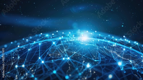Blue connection network shining across a digital globe, symbolizing global communication and connectivity.