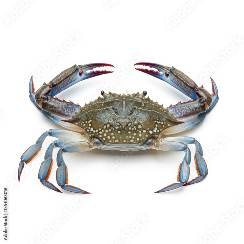 Blue crab isolated on white background for culinary, scientific, and educational purposes.
