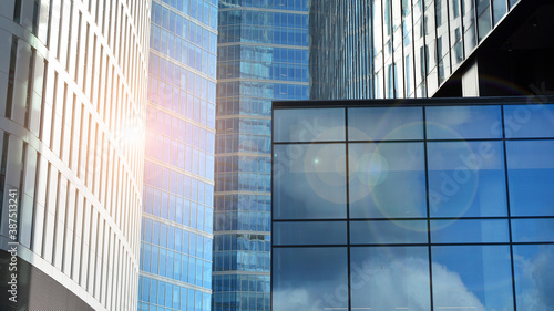 Blue curtain wall made of toned glass and steel constructions under blue sky. A fragment of a building. Glass facades on a bright sunny day with sunbeams in the blue sky.