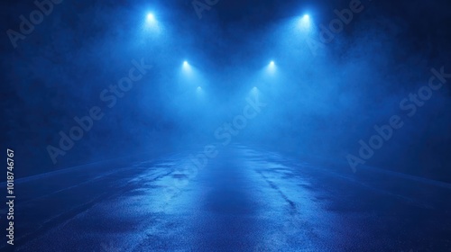 Blue dark background of empty foggy street with wet asphalt, illuminated by a searchlight, laser beams, smoke