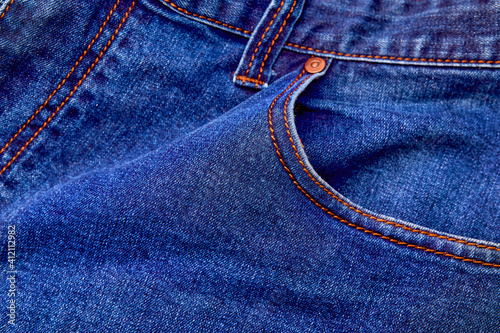 Blue denim jeans background pocket with seam and orange thread stitches.