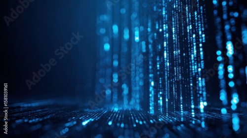 Blue digital code streams vertically across a dark background, creating a futuristic, high-tech, and immersive cyber environment