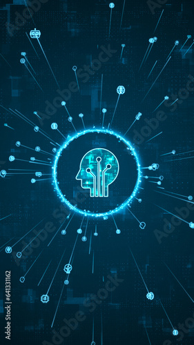 Blue digital robot head logo and AI icons rotation around with ai icons spread and line on abstract background with Ai chatbot and machine learning technology