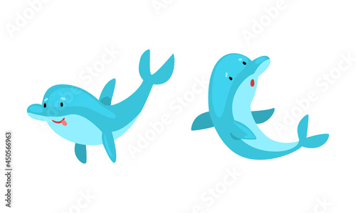 Blue Dolphin Character Swimming and Floating Deep in the Ocean Vector Set