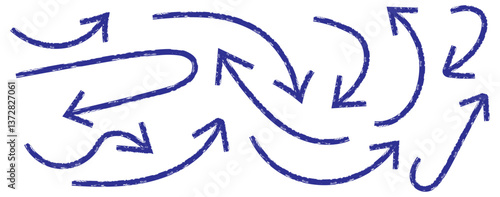 Blue doodle set on white background. Hand drawn set of doodle arrow icons. doodle marker thick arrows in different directions. Blue hand drawn brush arrow set. Grunge curved arrows set. Hand drawn