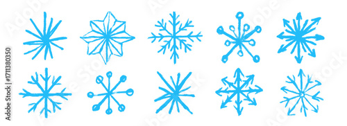 Blue doodle snowflakes collection. Crayon hand drawn snow flake set. Vector pastel chalk shape pack. Craft sparkle and crystal sketch elements for Christmas, New Year party, winter holiday decoration