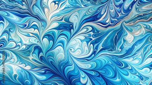 Blue Ebru Marbling Pattern with White and Turquoise Waves