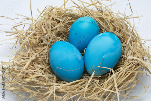 Blue eggs in nest on white background. Nest of eggs with white background. A nest of eggs lies on a white blue background. A nest of eggs lies on a blue lifestyle background.
