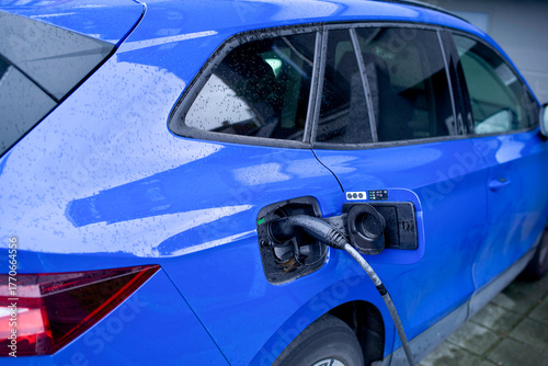 Blue electric car charging at a wet charging station on a rainy day. Blankenberge, West Flanders, Belgium