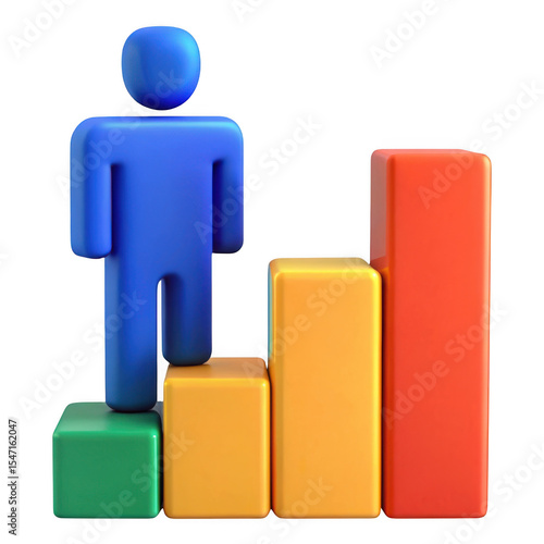 Blue figure ascending a colorful bar graph illustration on transparent background