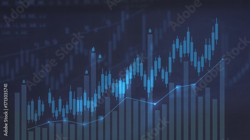 Blue financial candlestick chart with rising trend and bar graph background finance stock market