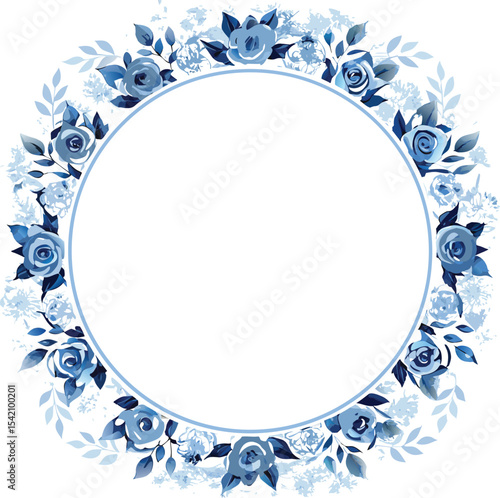 Blue Floral Circle Isolated, Watercolor Style Roses and Leaves Decoration