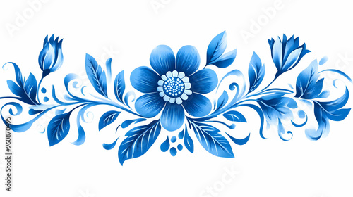 Blue Floral Ornament Hand Painted Gzhel Style Decorative Design Watercolor Illustration