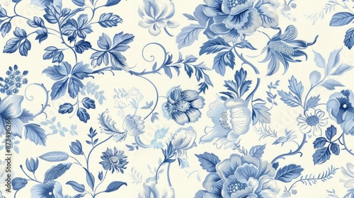 Blue floral pattern wallpaper. Elegant blue floral wallpaper with a white background. Perfect for a vintage or romantic interior design.