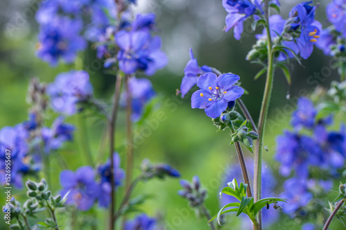 blue flowers and blue bell of campanula, campanula vulgare, macro close up.