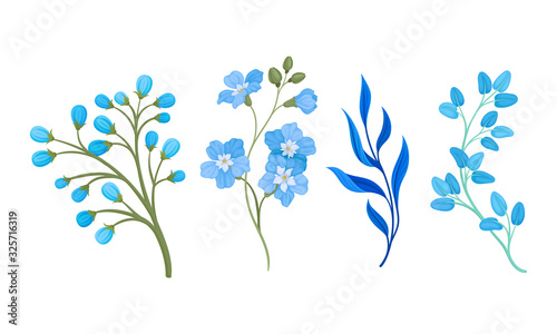 Blue Full-blown Flowers and Leaves Decorative Elements Vector Set