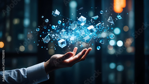 Blue Geometric Shapes Floating Above Hand Dark Background