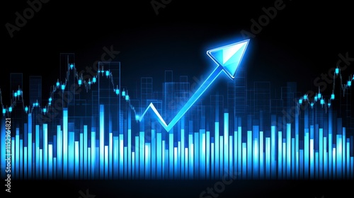 Blue glowing arrow up, financial growth chart, city skyline background.