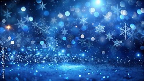 Blue glowing snowflakes and bokeh lights on winter night background.