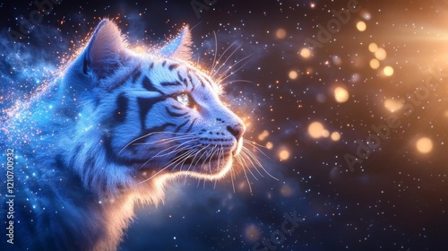 Blue glowing tiger in starry sky with cosmic lights. Generative AI