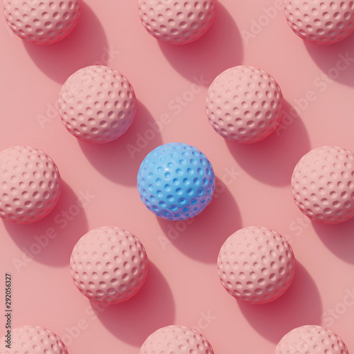 Blue golf ball color white many white golf ball on pink background color. minimal sport idea. 3D render.