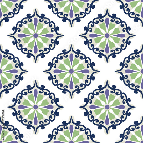 Blue, green, and white embroidery, motif ethnic ikat seamless textile illustration, print striped ornament, pattern, design for wrapping, silk, scarf, clothing, background, textile, carpets, curtains.